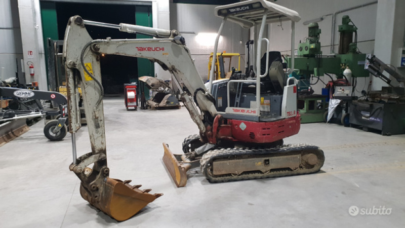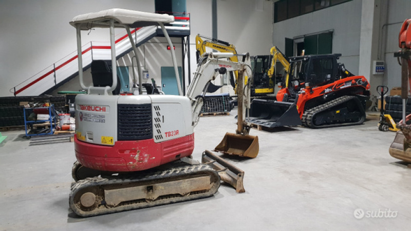 Miniescavatore usato takeuchi TB 23R Anno di costruzione 2014 con : Tettuccio di sicurezza Congoli in gomma 80 % Pero operativo 2423 Kg. Impianto martello Motore yanmar da 19 Cv Larghezza totale sotto carro 1400mm. Profondità di scavo 2560mm Pompa a porta variabile da 70lt. Totale Certificato C.E. Benna da scavo 600 mm.